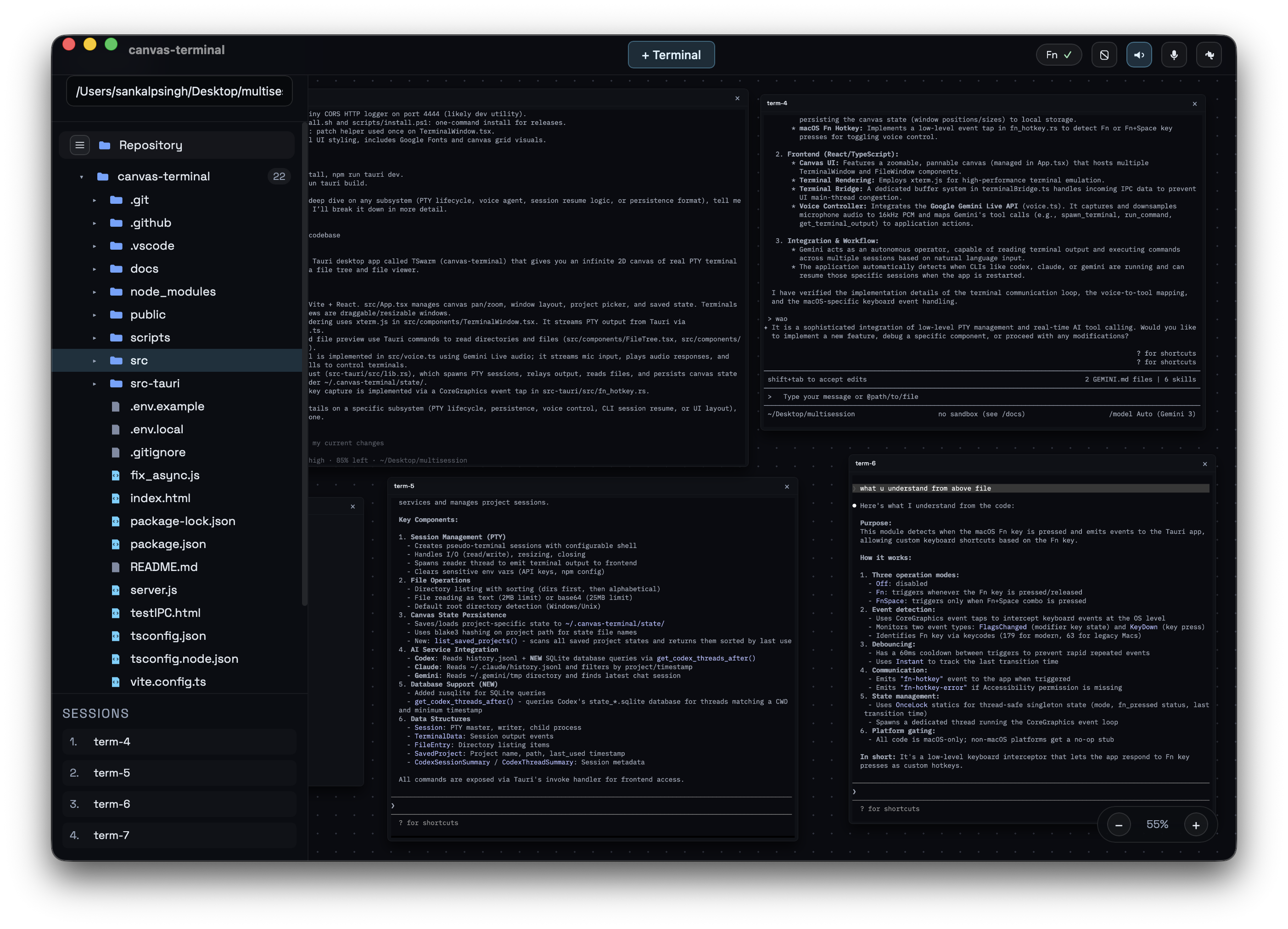 Open unlimited terminals on a canvas